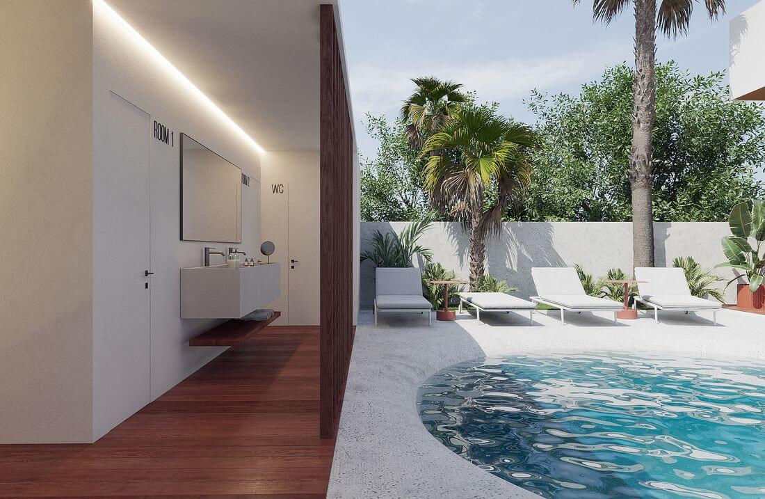 В интерьере использованы оттенки серого, бежевого, терракотового и синего, что создает уютную и современную атмосферу. Большие окна от пола до потолка в спальнях пропускают свет и придают помещению простор.